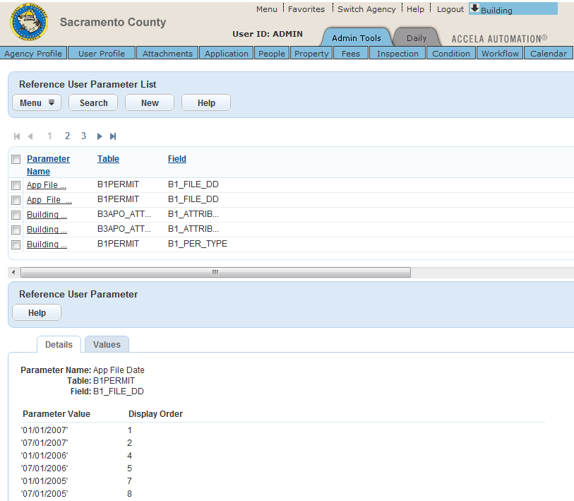 Civic Platform displays the Reference User Parameters - Look Up portlet.
