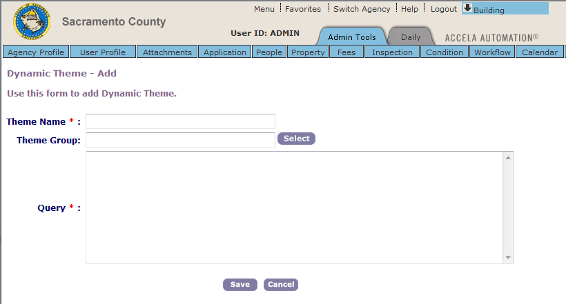 Theme Name Enter a unique name for the dynamic theme. For example, enter “All Building Activities last 30 Days”. Theme Group Select the dynamic theme group to which you want to add the dynamic theme. Click the Select button to select an existing theme group or add a new theme group. Although not required, it is recommended to assign a theme group to help organize multiple dynamic themes as they appear on the list of map layers on the Layers widget. Query Enter an SQL query string in a language that is compliant with your agency’s database.