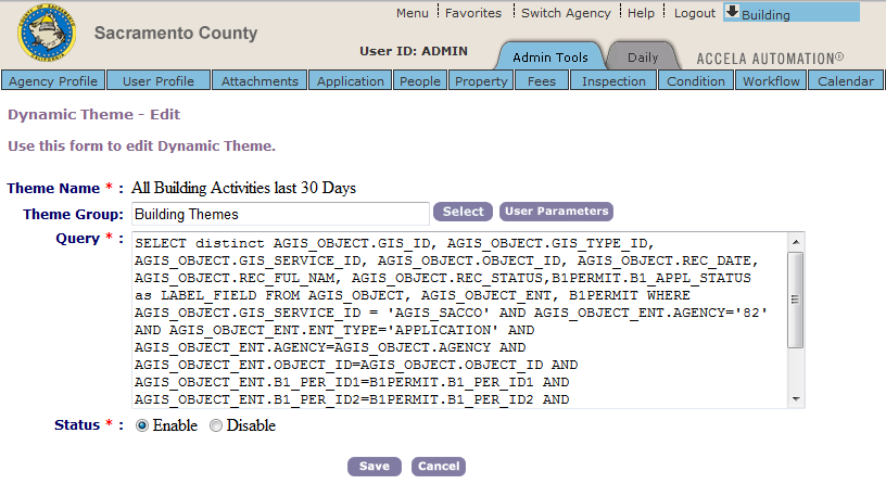 Theme Group Click the Select button to select an existing theme group or add a new theme group. Query Update the SQL query as necessary. Status Click Enable or Disable to determine whether the dynamic theme is available for GIS use. When it is disabled, you cannot retrieve it from Civic Platform and apply it to your map service through the GIS Administration site.
