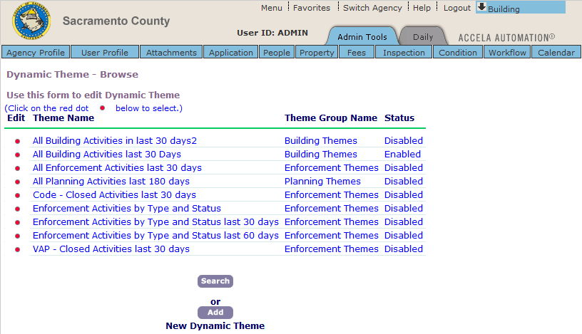 If there is a need to delete a dynamic theme, instead of deleting a dynamic theme, set its status to Disabled it so it remains in Civic Platform in case you want to use it at a later date.