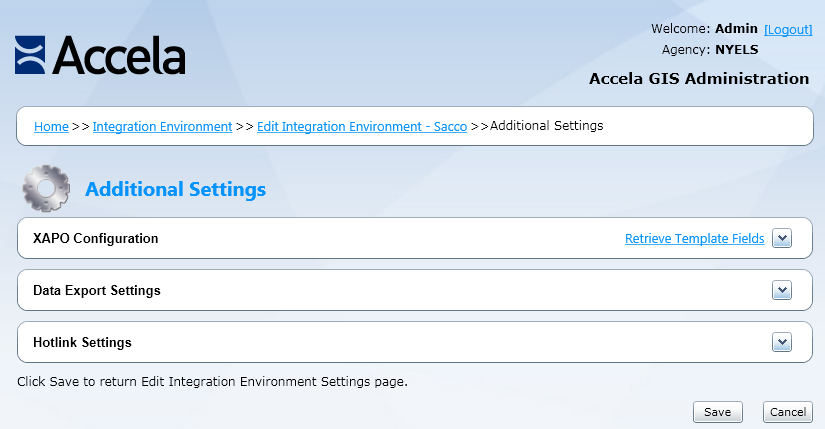 The Accela Silverlight GIS Administration site displays the Additional Settings page.