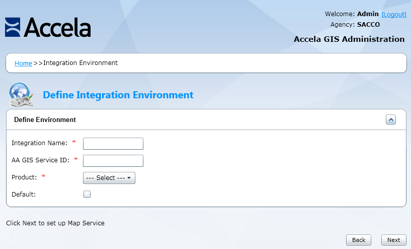 The Accela Silverlight GIS Administration site displays the Define Integration Environment page.