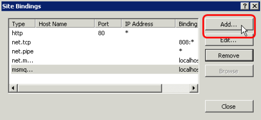 7. Click the OK button to close the Site Bindings dialog box, and then click the Close button to close the Add Site Binding dialog box.