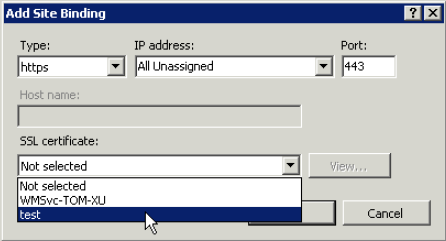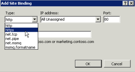 Type Select “https” from this drop-down list. Then IIS Manager refreshes and displays the Add Site Binding dialog box as follows: