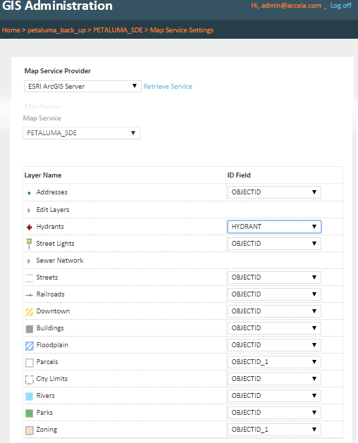- The ID Field connects the map layer in your map provider’s geodatabase to the Accela GIS database. For example, if you select HYDRANT as the ID Field for Hydrants (as illustrated in Figure 1), then objects in the Hydrants map layer are identified by the HYD_NUMBER field in the Accela GIS database.